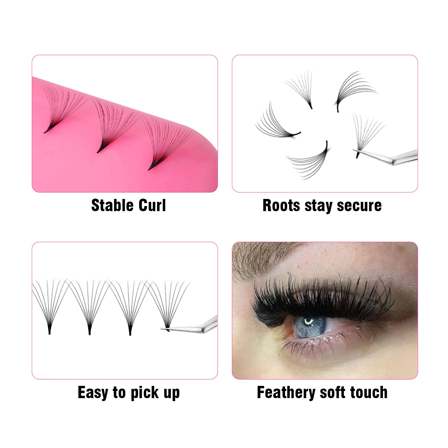 Unsere handgefertigten, 10D-Wimpern mit spitzer Basis und 1000 losen Fächern ermöglichen Ihnen, für Ihre Kundin ein individuelles Mega-Volumen-Set mit erstklassiger Hybrid- und Mega-Volumen-Technik zu kreieren. Die Wimpern werden zu 100 % in Handarbeit mit Heat-Bond-Technologie hergestellt und zeichnen sich durch ein ultraweiches, federleichtes Tragegefühl und einen tiefmatten, schwarzen Effekt aus. Durch das geringe Gewicht der Fächer entsteht ein natürlicher Look für ein wunderschönes Wimpernergebnis.